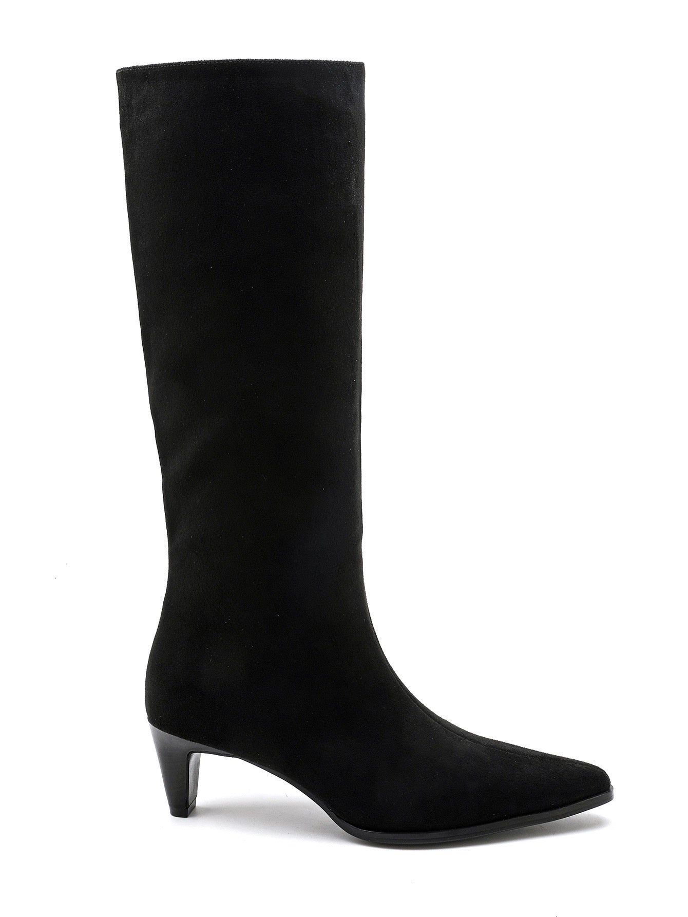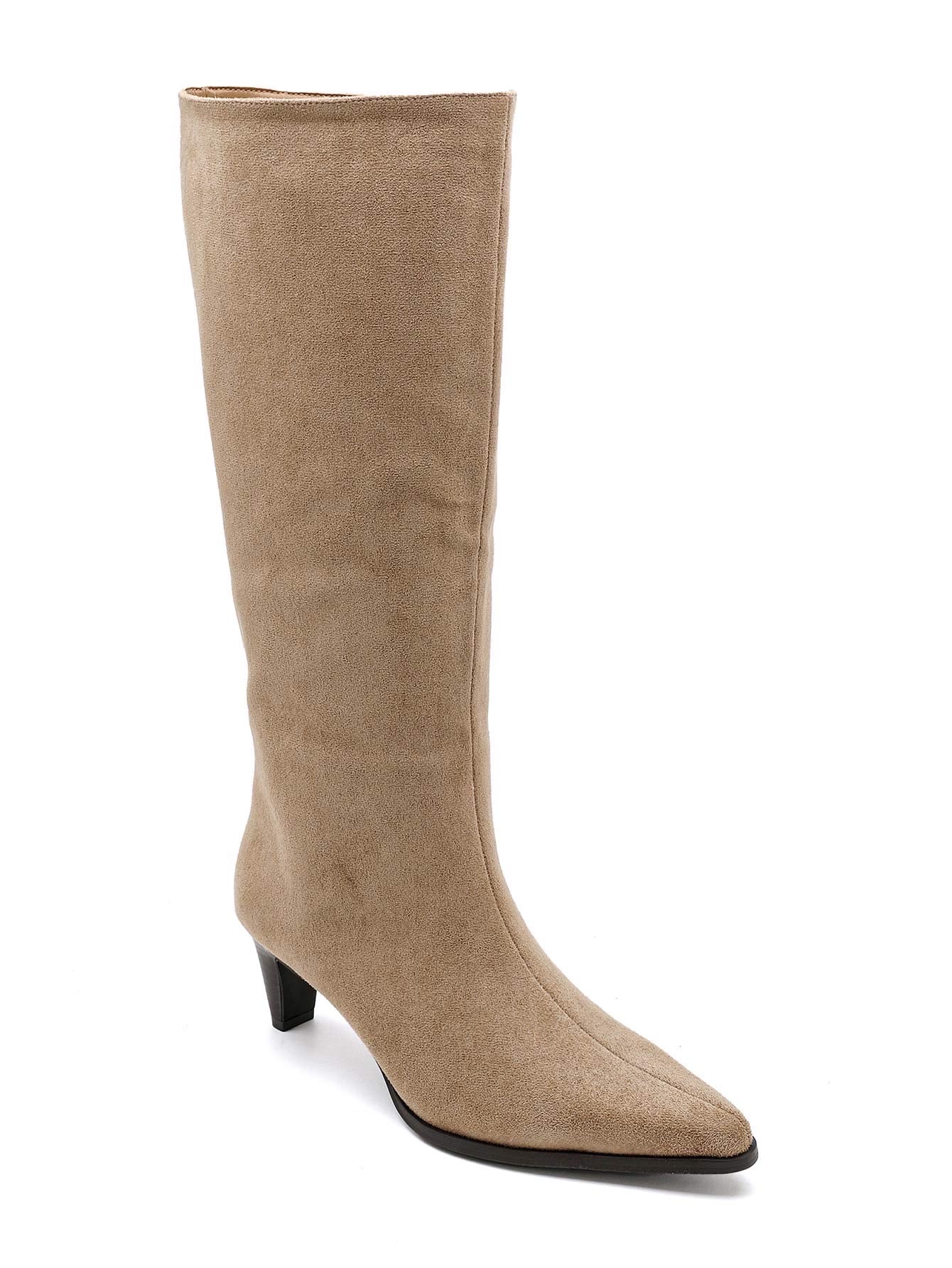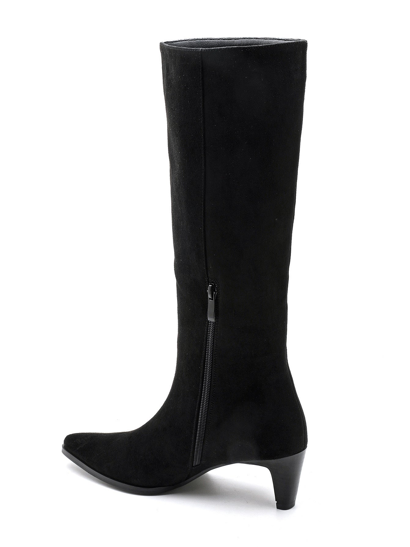 Bota em camurça término em bico arredondado, fecho lateral, salto de 3 cm/s