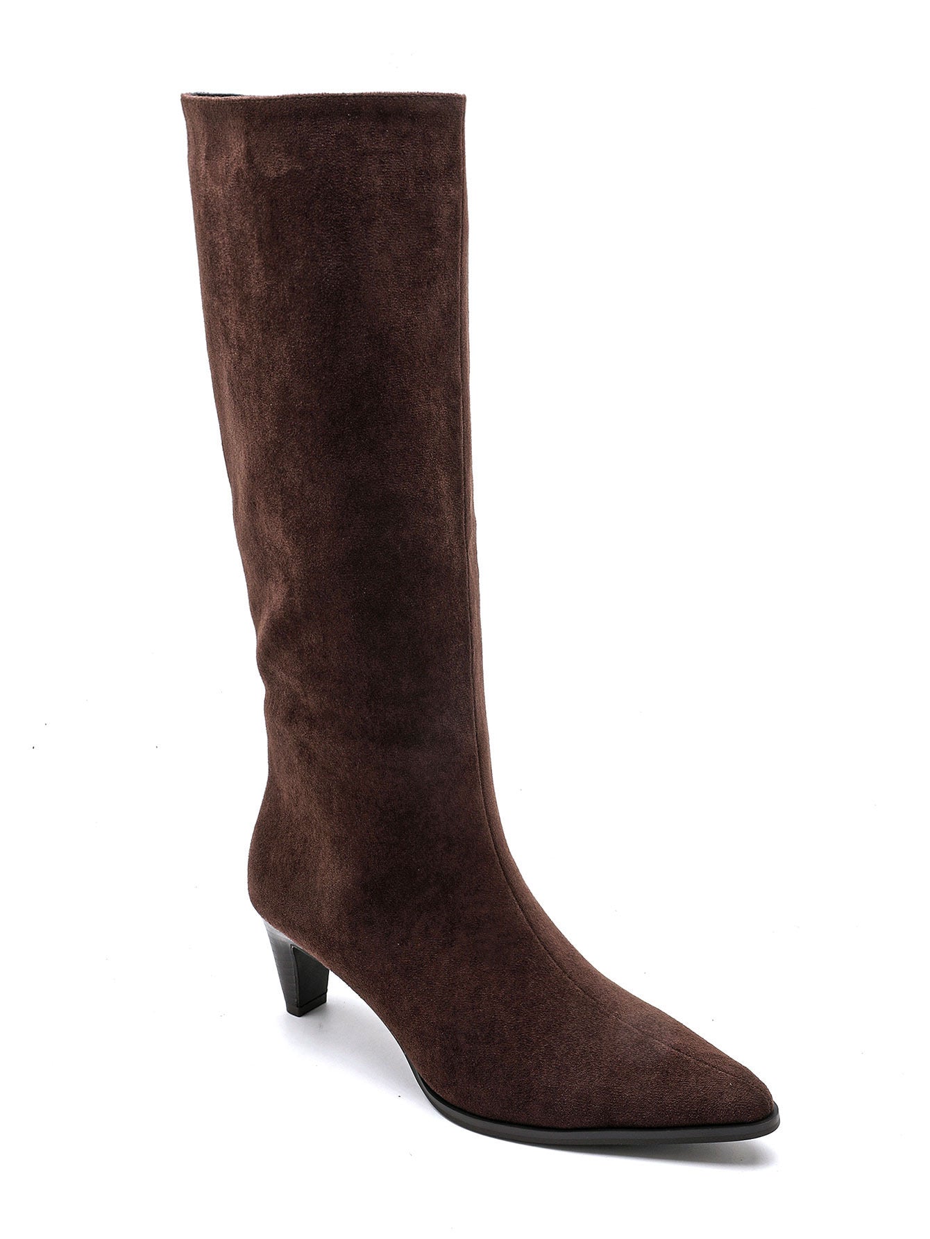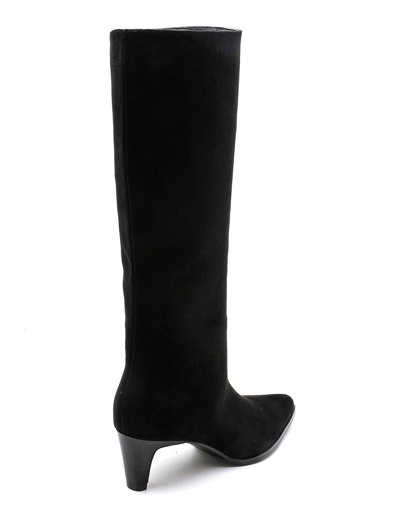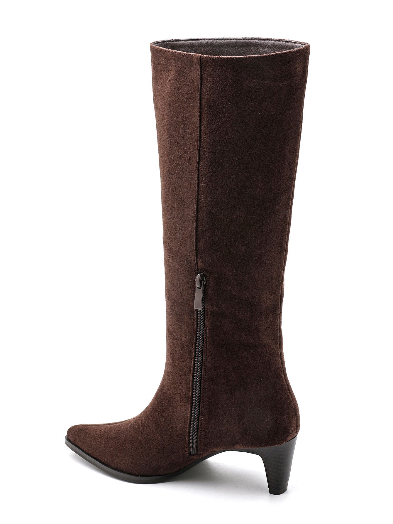 Bota em camurça término em bico arredondado, fecho lateral, salto de 3 cm/s