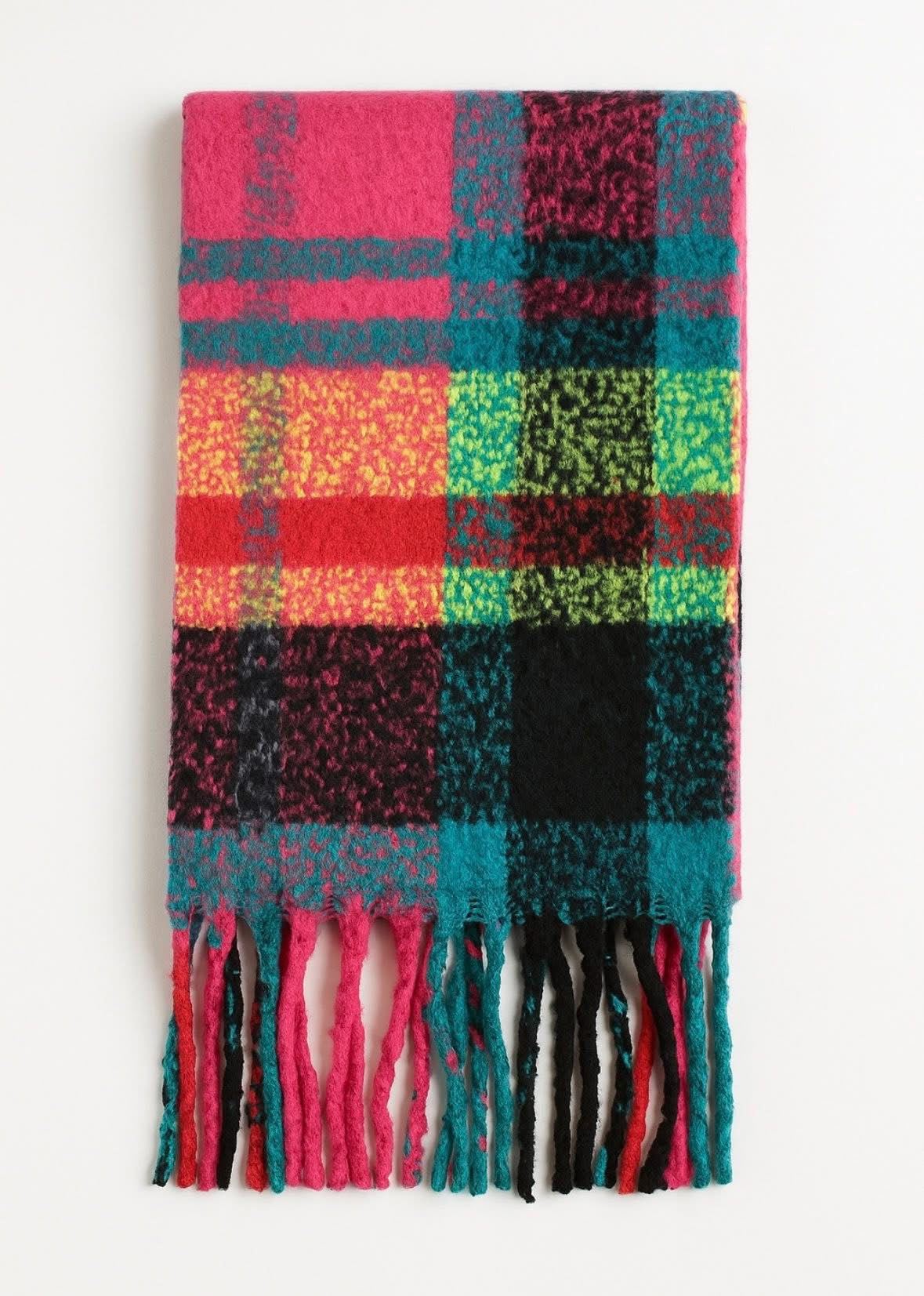 Cachecol comprido aos xadrez em tons de rosa, azul e preto