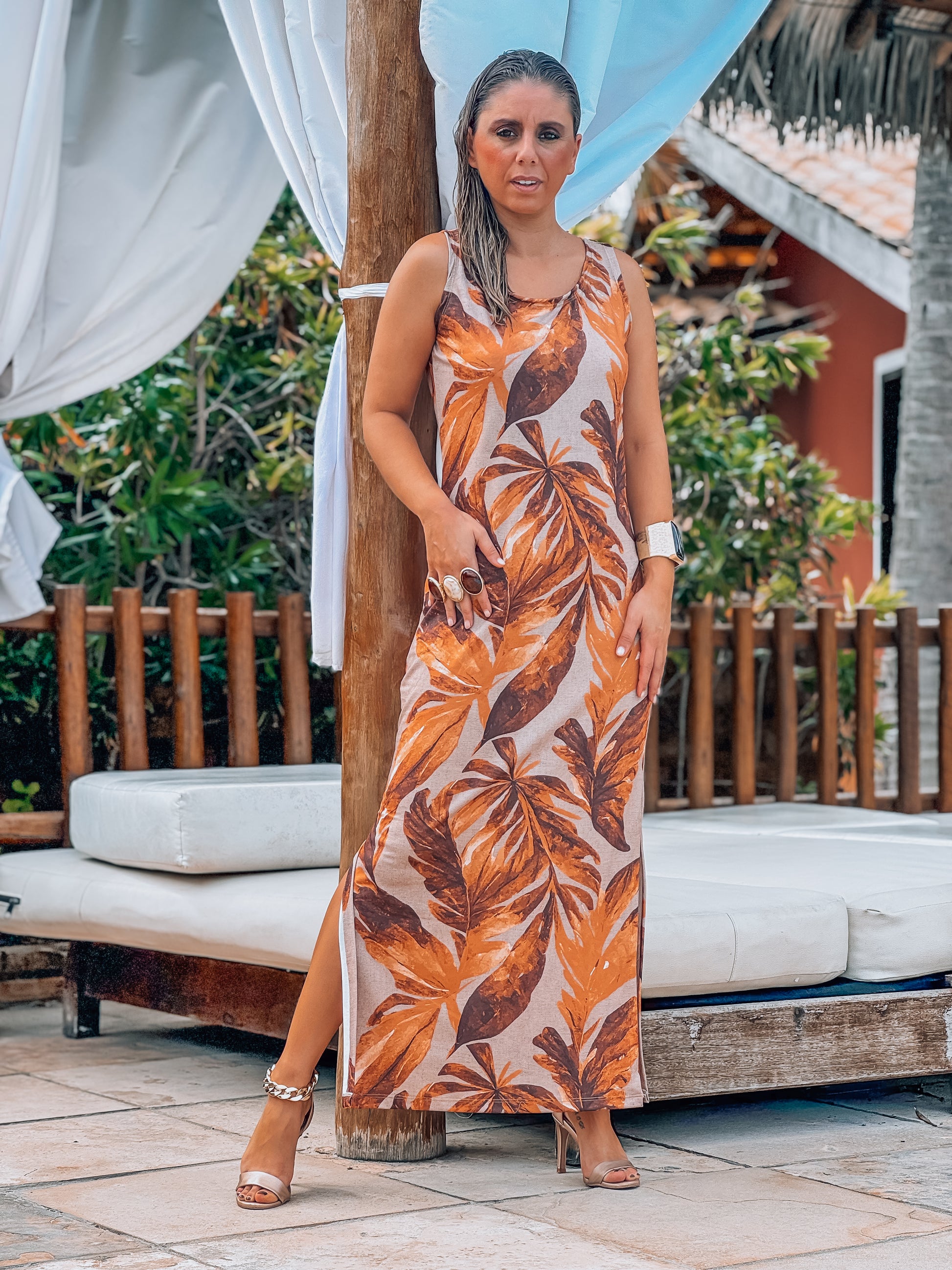 vestido longo manga cava composto de malha fria e algodão