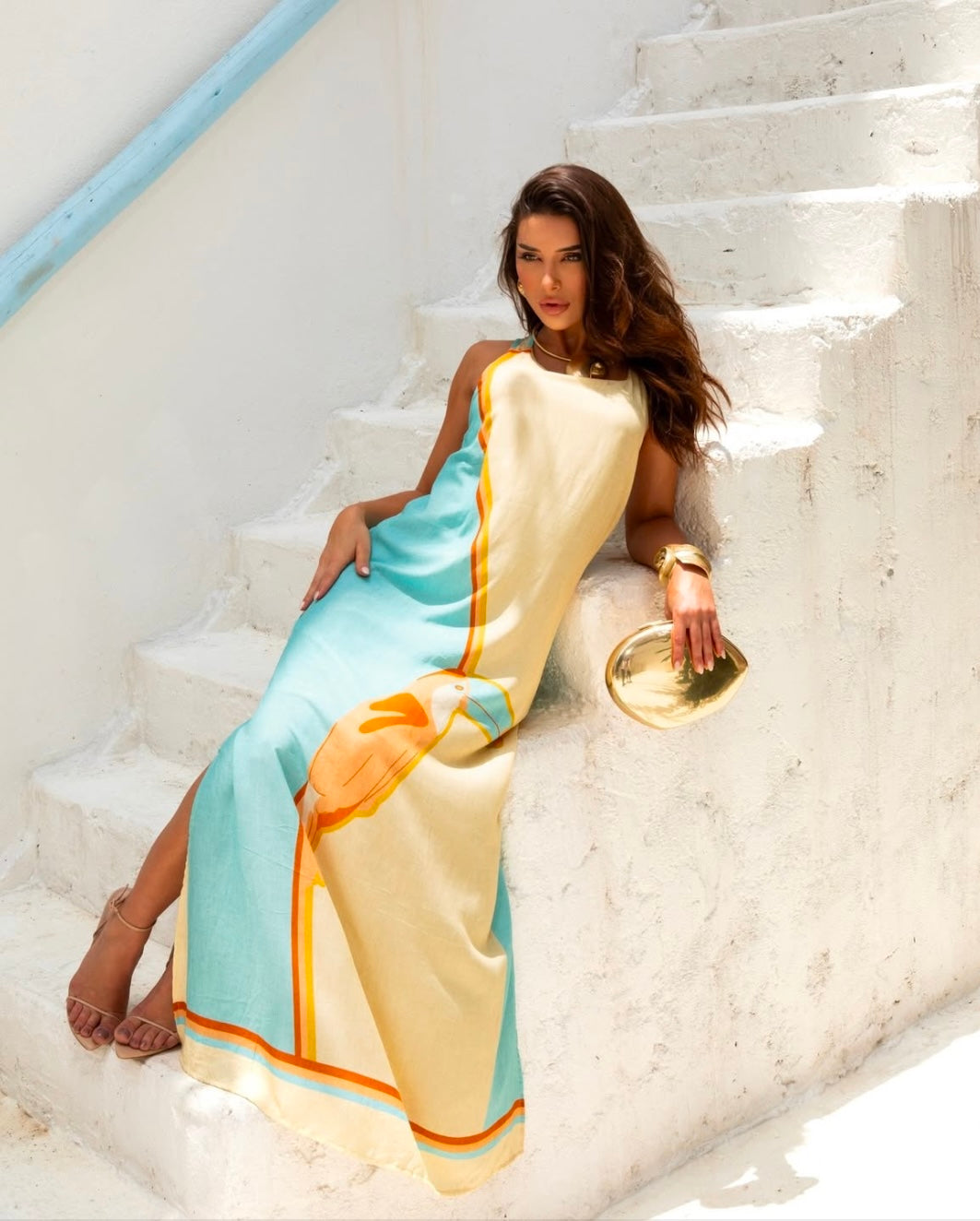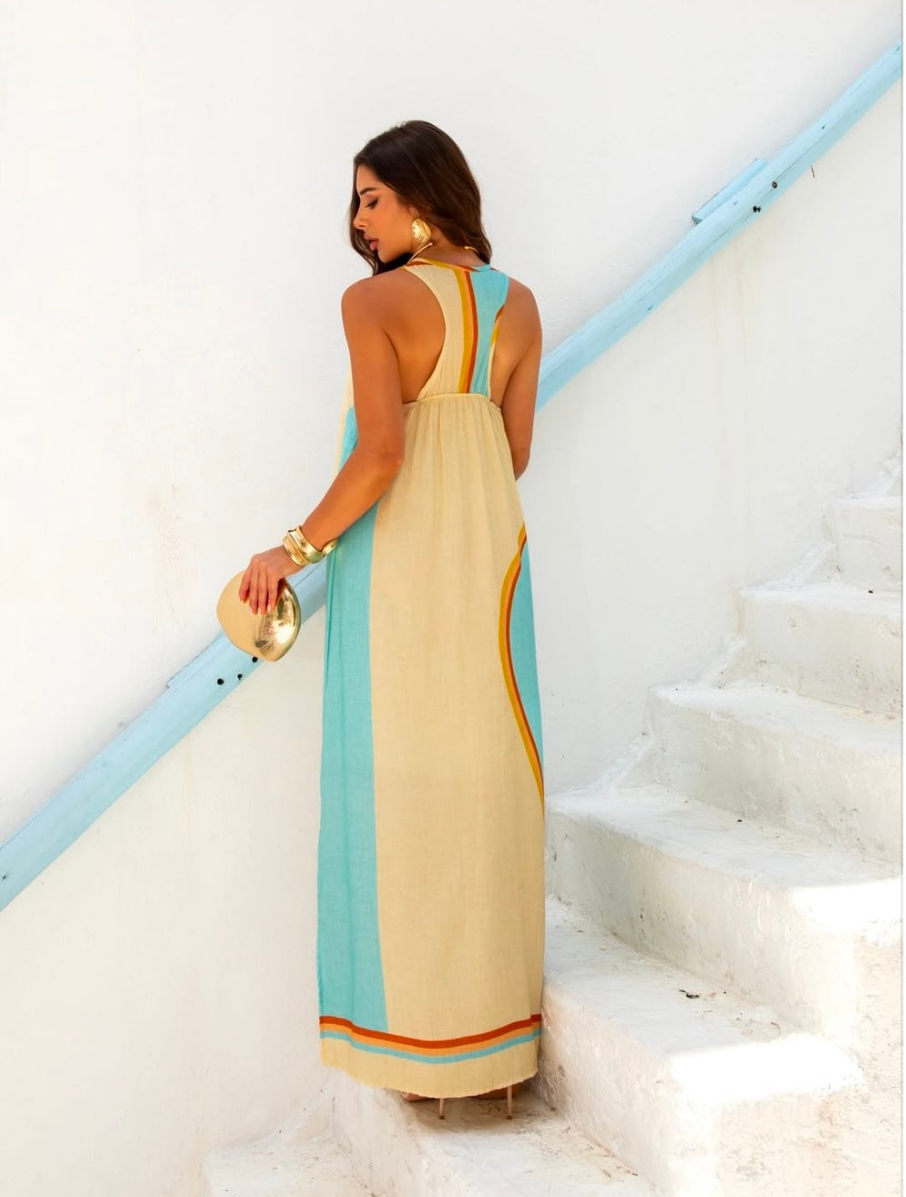 Vestido em viscose e algodão com forro pelo joelho, o que lhe dá uma textura delicada.